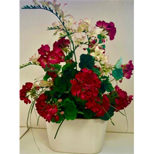 Beautiful silk flowers in a white porcelain container. Perfect to decorate your home. Measures 20” High; 14” Wide. Very Good Condition.All Antiques and Collectibles are from a private collection.FOR M