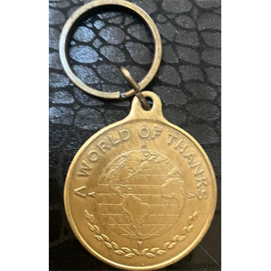 Vintage World Of Thanks Key Chain. Circa 1990’s.Great looking gold tone key chain. Measures 1 1/2” in Diameter. read more...